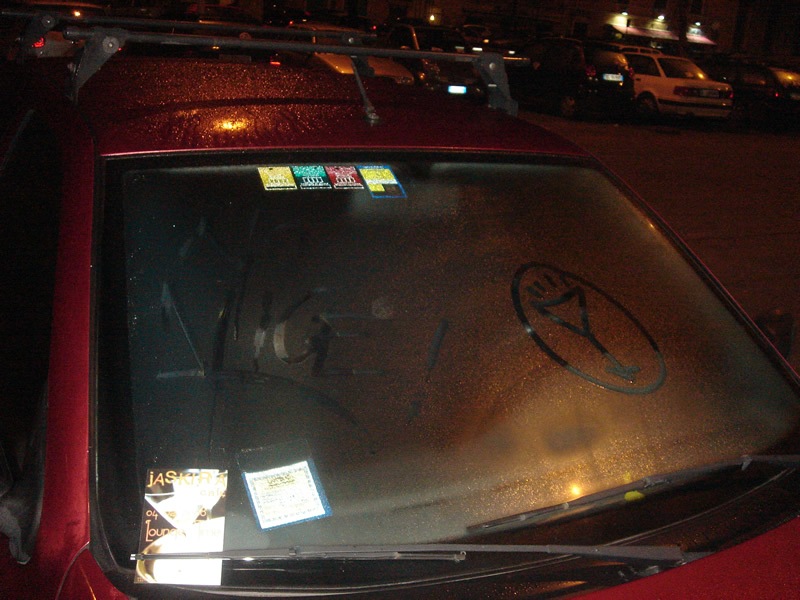 É o caso desta ação que está começou na Itália e está se espalhando pela Europa, onde centenas de pequenos adesivos com o desenho estilizado de uma típica taça de martini estão sendo colados em diversos locais. Como a legislação européia para propaganda sobre o consumo de álcool é bem restritiva, eu deduzo que esta seja realmente uma campanha para alguma marca de bebida. Até escrever na sujeira e na cerração que fica nos carros está valendo.